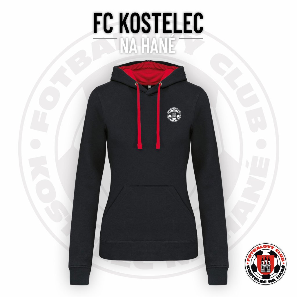 Dámská dvoubarevná mikina s kapucí přes hlavu FC KOSTELEC "DECENTNÍ" - černo/červená
