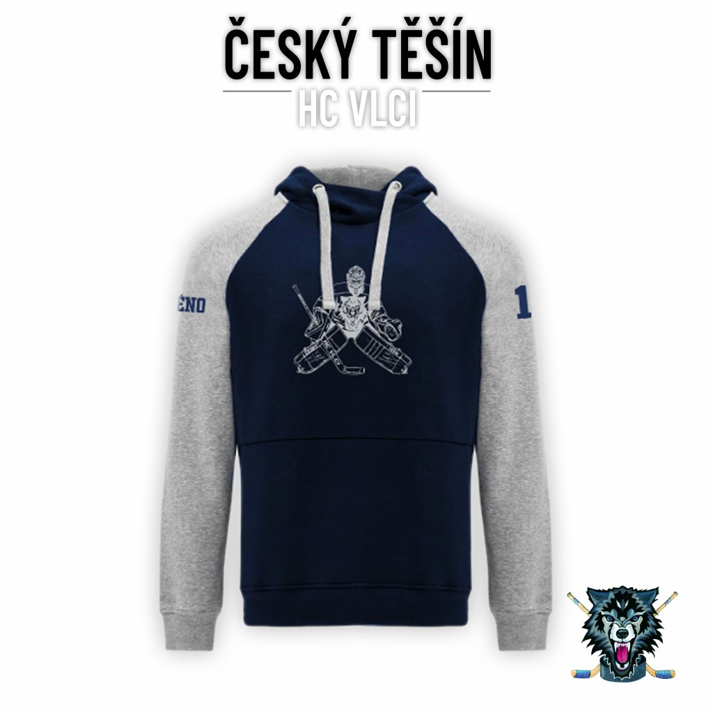 Dětská mikina přes hlavu s překříženým výstřihem HC Vlci Český Těšín "silueta gólmana"- tmavě modrá/šedá