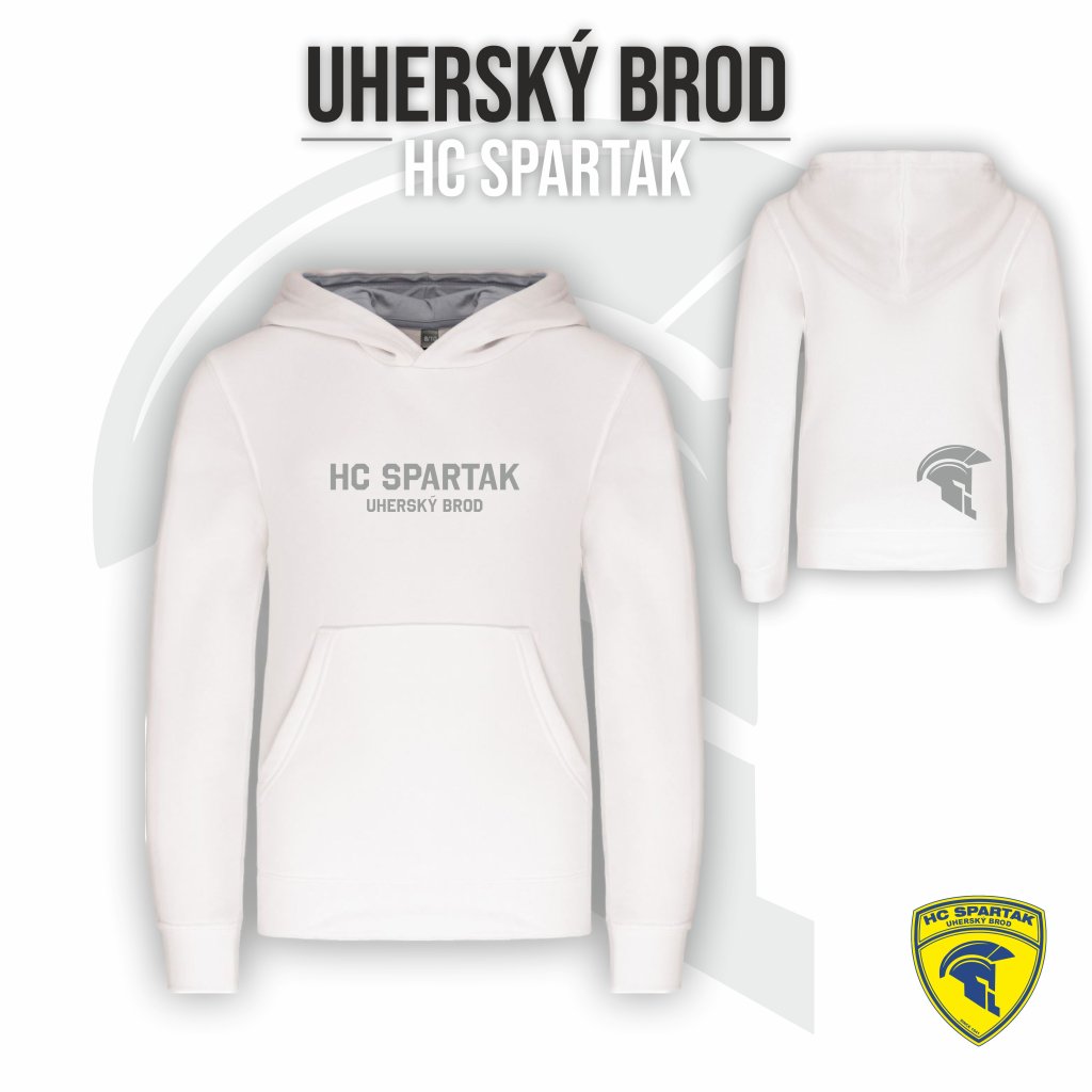 Dětská bavlněná mikina "klokan", v provedení bílá/šedá, s názvem vašeho milovaného klubu vepředu a stylovou spartakovskou helmicí na zádech. Za příplatek možnost personifikace (jmenovka, číslo, přezdívka, nápis - např. MALÝ SPARTAKOVEC).