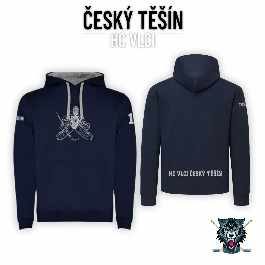 Dětská mikina s kapucí přes hlavu HC Vlci Český Těšín "silueta gólmana" - tmavě modrá/šedá