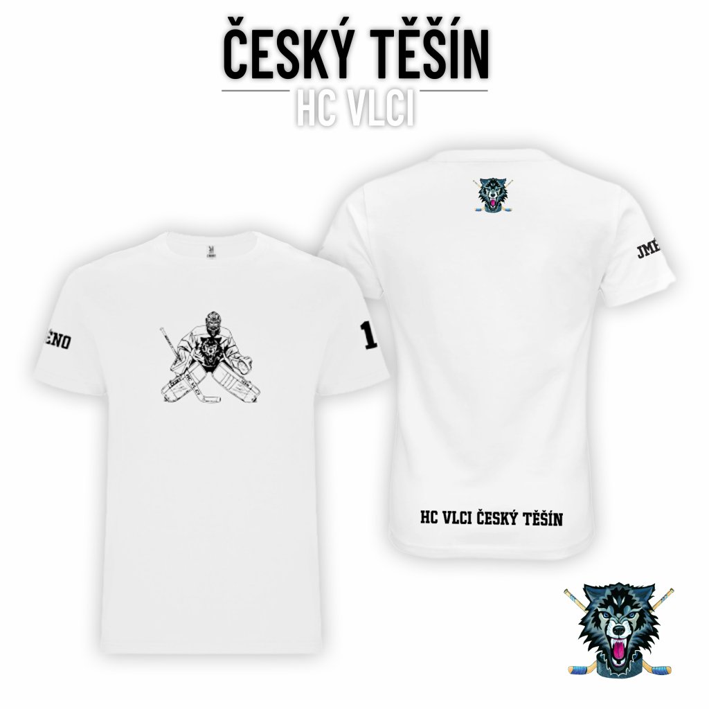 Dospělé bavlněné tričko s krátkým rukávem HC Vlci Český Těšín "silueta gólmana" - bílé
