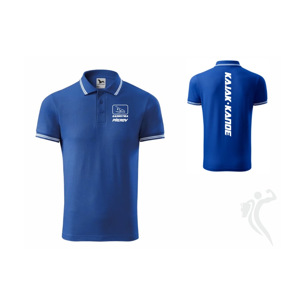 Stylová bavlněná polokošile v modrém provedení s bílými proužky na rukávech a límečku, specifikace brandingu: logo vepředu - výšivka, nápis KAJAK-KANOE vzadu - potisk.
