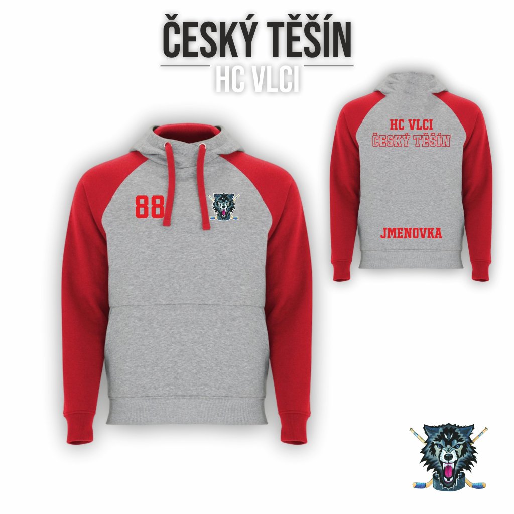 Unisex mikina s kapucí přes hlavu "klokan" HC Vlci Český Těšín - šedo/červená (možnost personifikace - jmenovka, číslo)