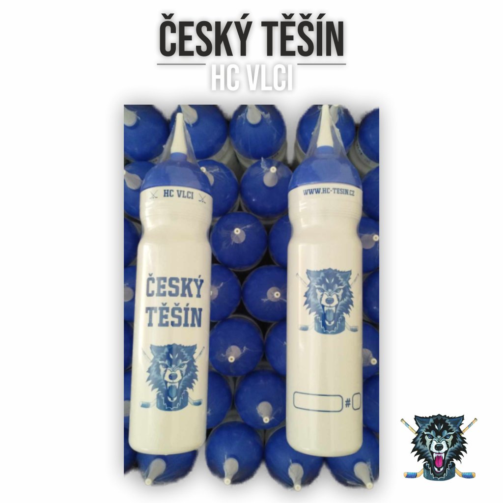 Zdravá sport lahev HC Vlci Český Těšín 1,0l - bílá lahev, modré víčko, bílá hubice, náhradní uzávěr